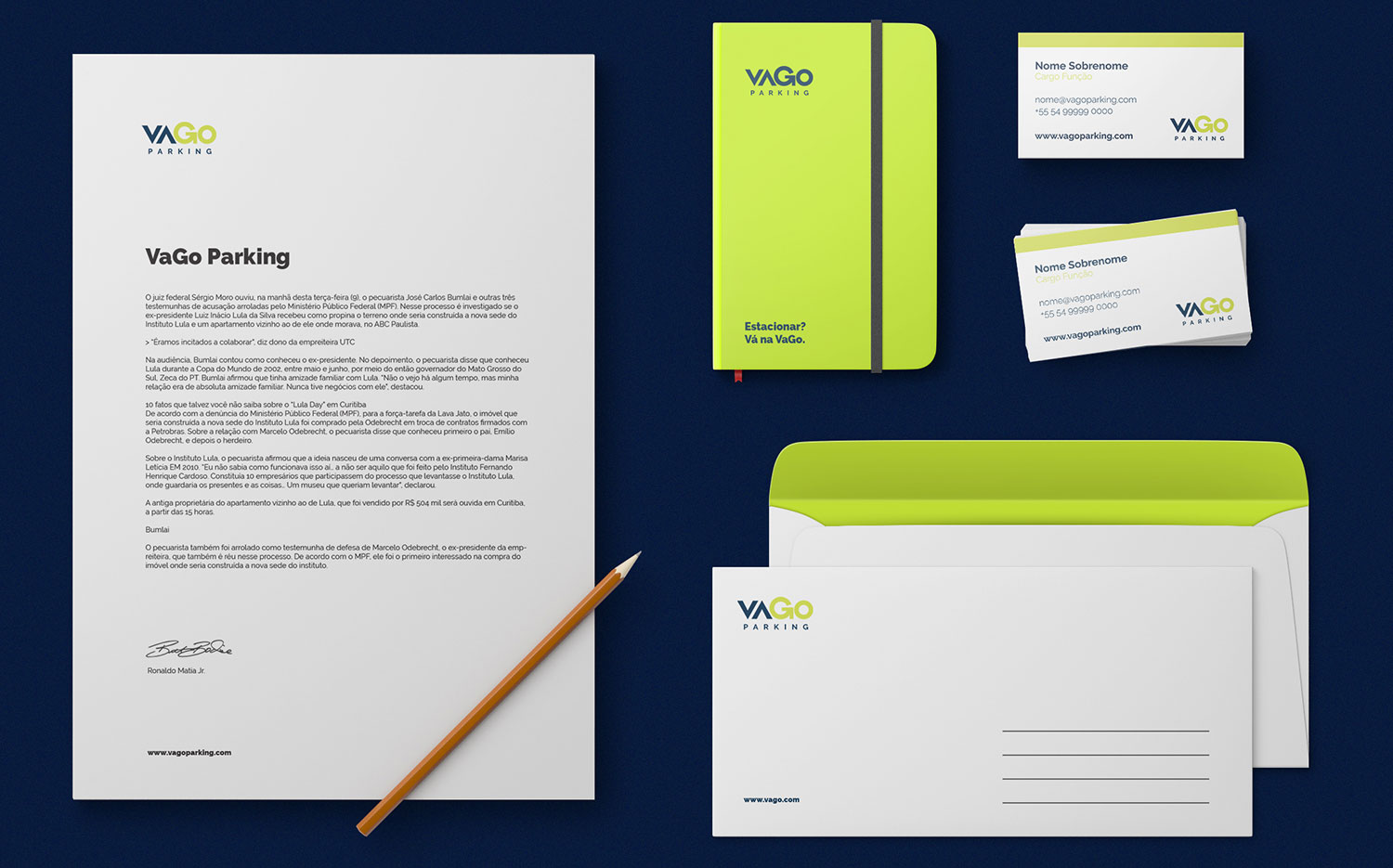 Destaque para o símbolo - a letra G do nome - que representa a rotatividade do estacionamento e o uso do verde limão para destacar a marca em meio ao centro urbano e referenciar a sinalização interna e de funcionários.