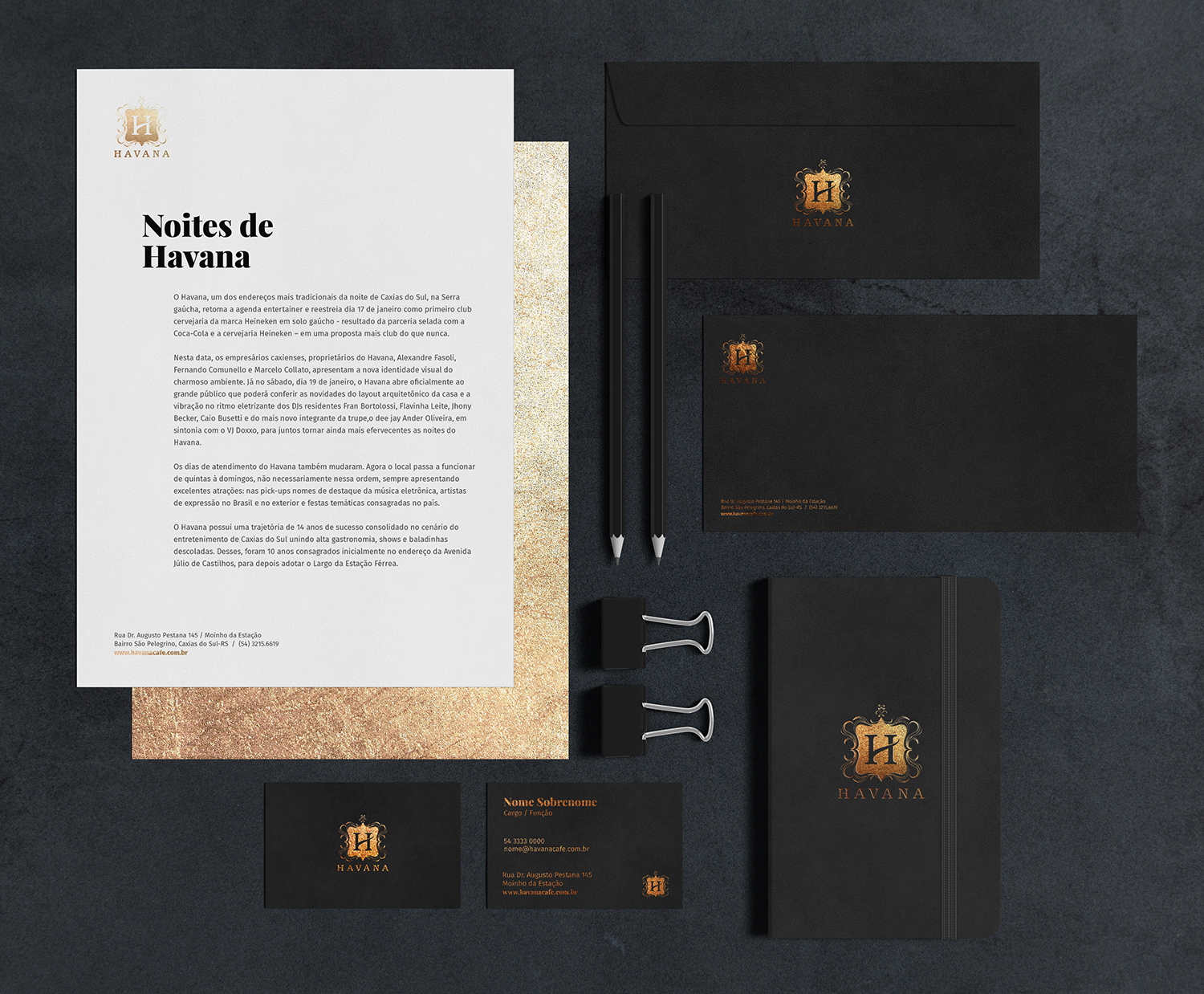 O Havana foi uma notória, conhecida e admirada casa noturna de Caxias do Sul. Para criação da identidade visual, nos baseamos em três características que formavam a cultura da casa: o luxo, a moda e a sensualidade.